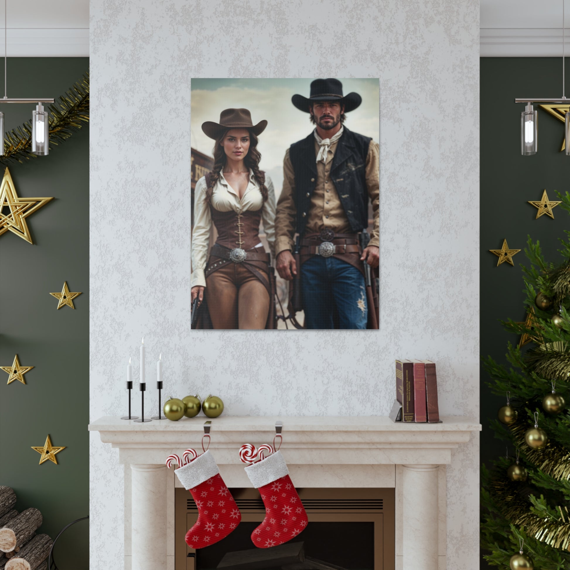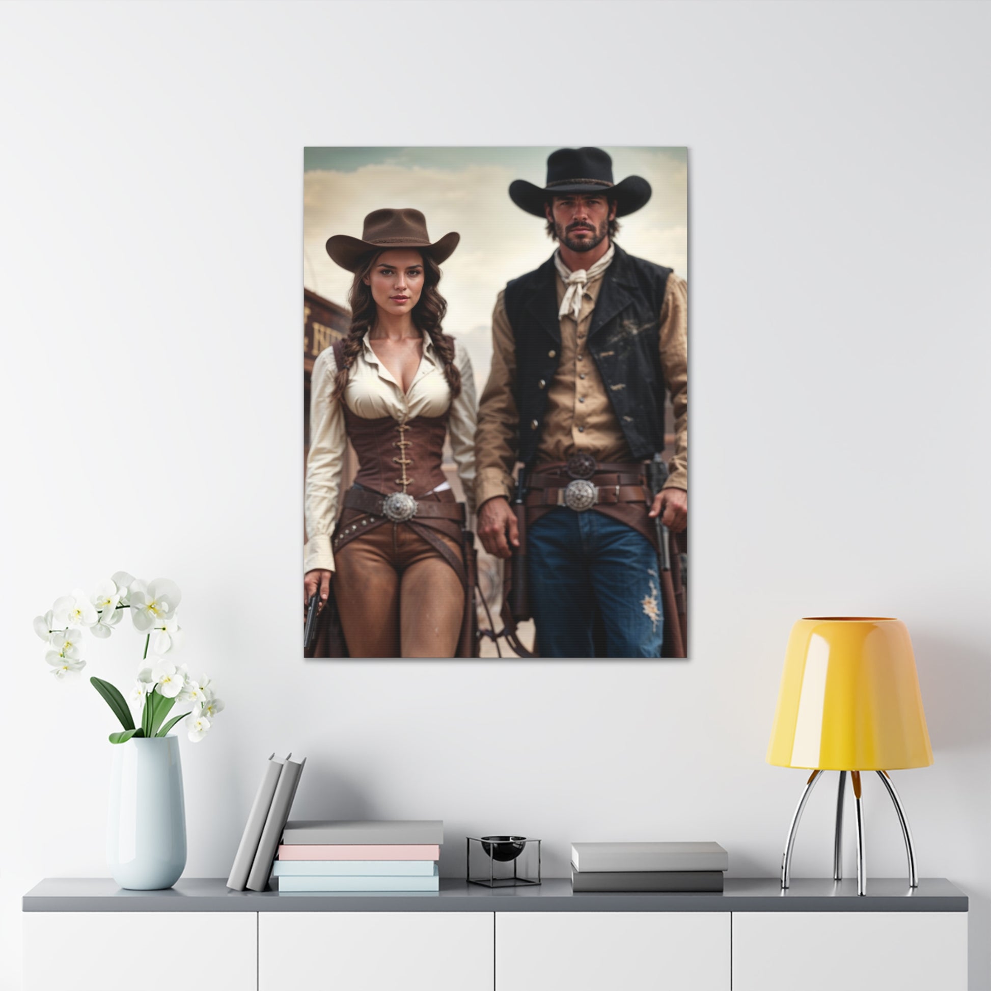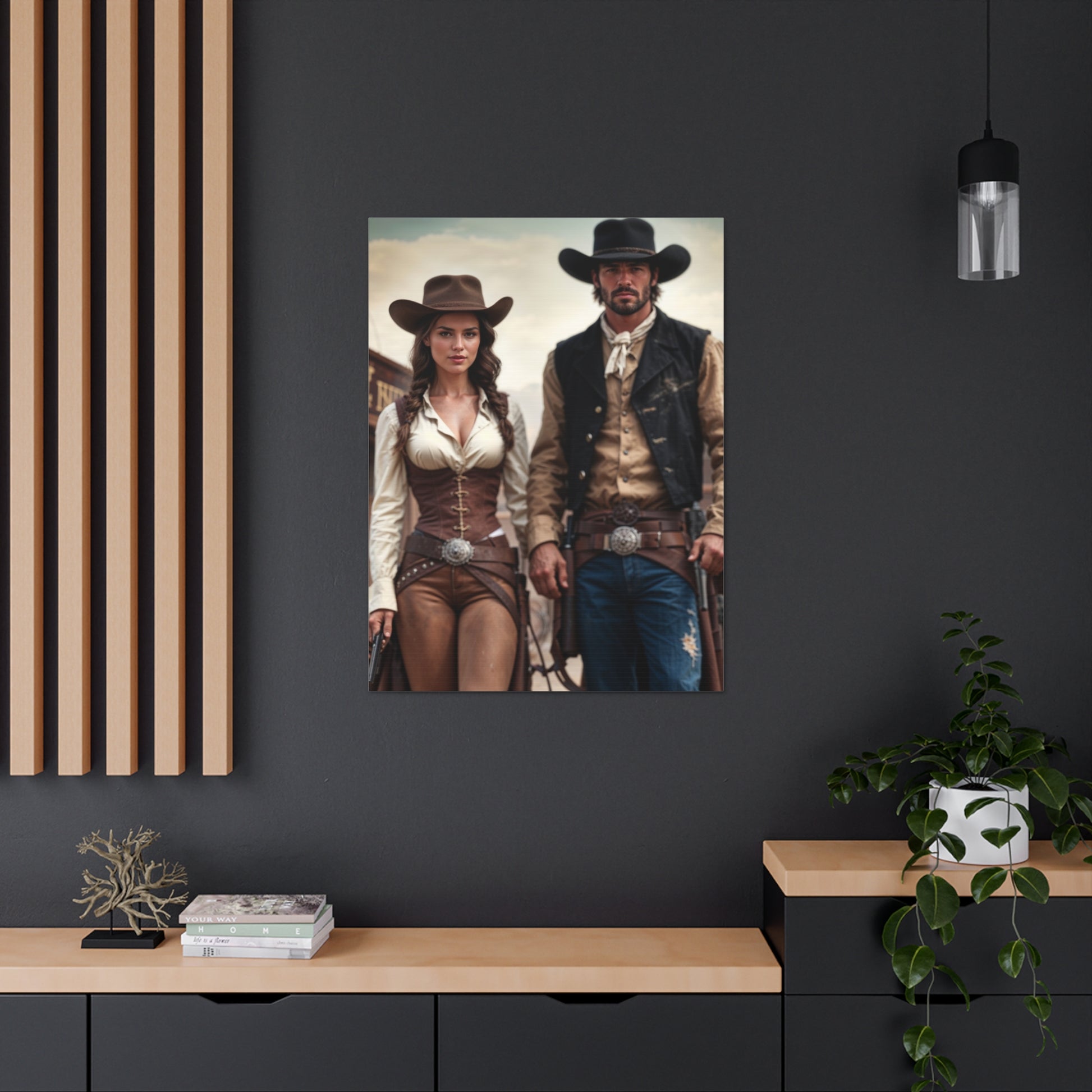 Channel the wild spirit of the Old West with our Western Outlaw Duo custom portrait. Perfect for partners in crime, this artwork transforms your photo into a cinematic western scene—cowboy hats, holsters, dusty boots, and all!