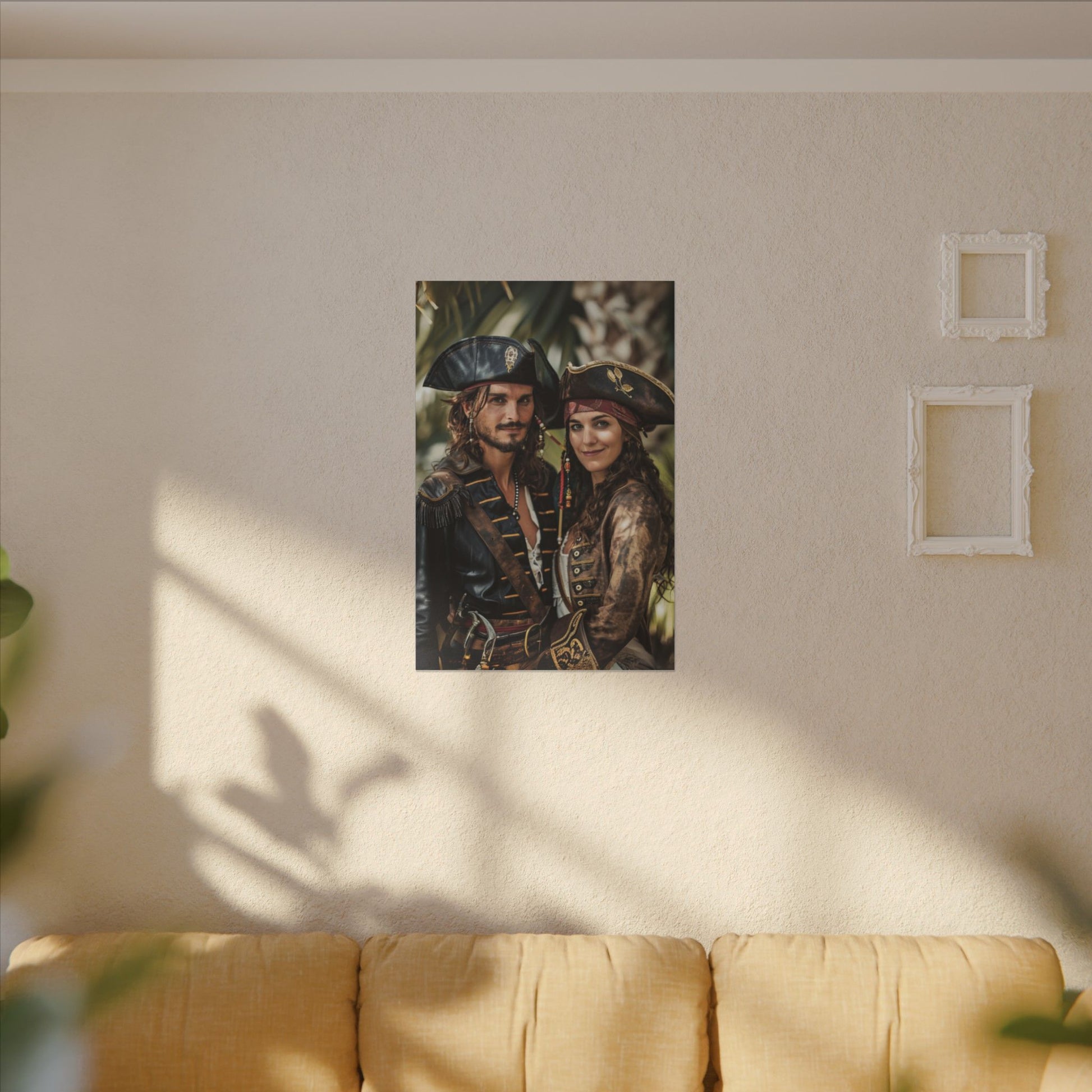 Bring adventure to your wall with a bold pirate couple portrait — cinematic, detailed, and set against a vivid island backdrop. Perfect for storytellers, dreamers, and sea-loving duos.