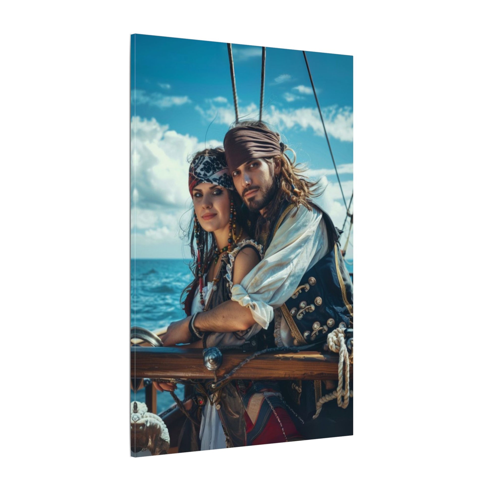 Capture the adventurous spirit of love with this cinematic portrait of a pirate couple, exuding high realism as they stand proudly aboard their ship. Set against a stunning seascape with bright skies and intricate details, this custom piece brings your bold, romantic story to life. Perfect for any pirate enthusiast or couple looking to add a touch of adventure to their space!